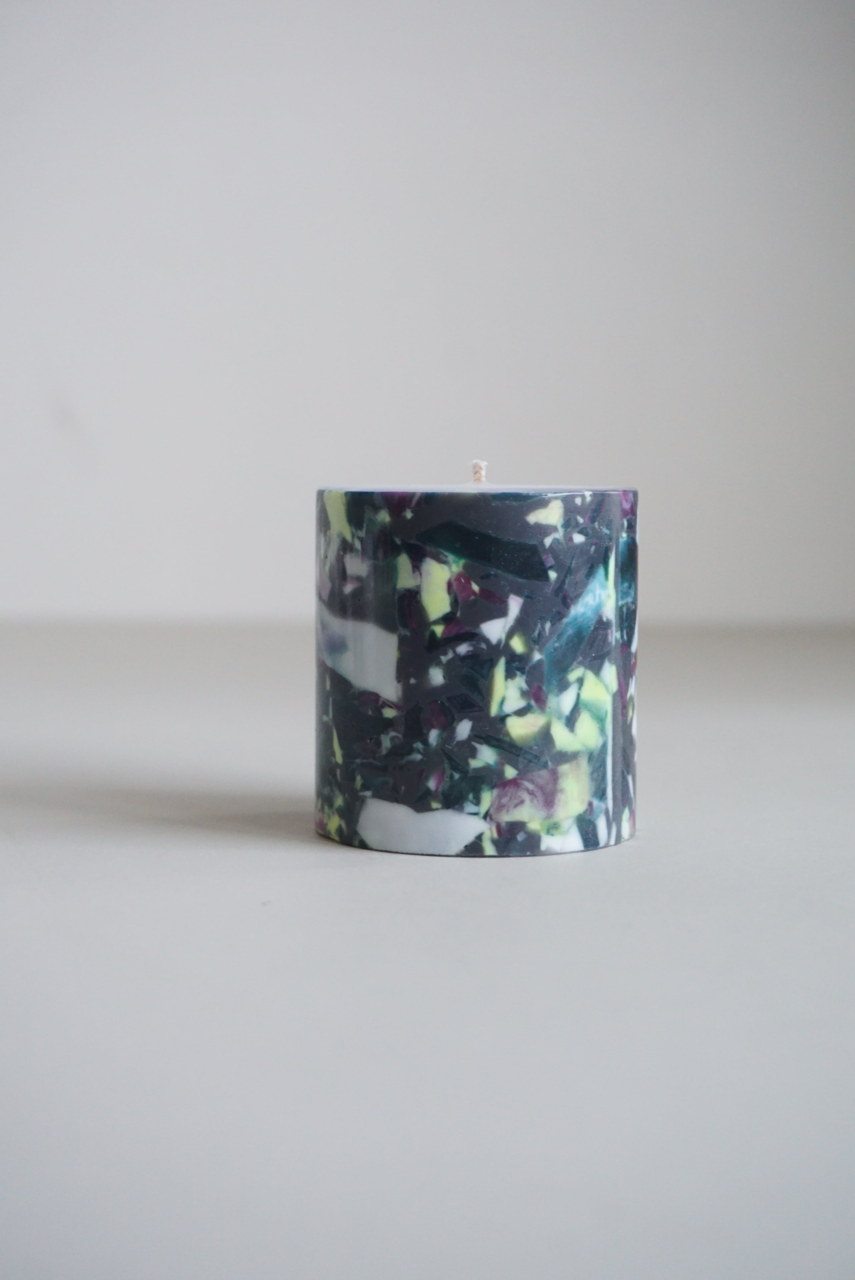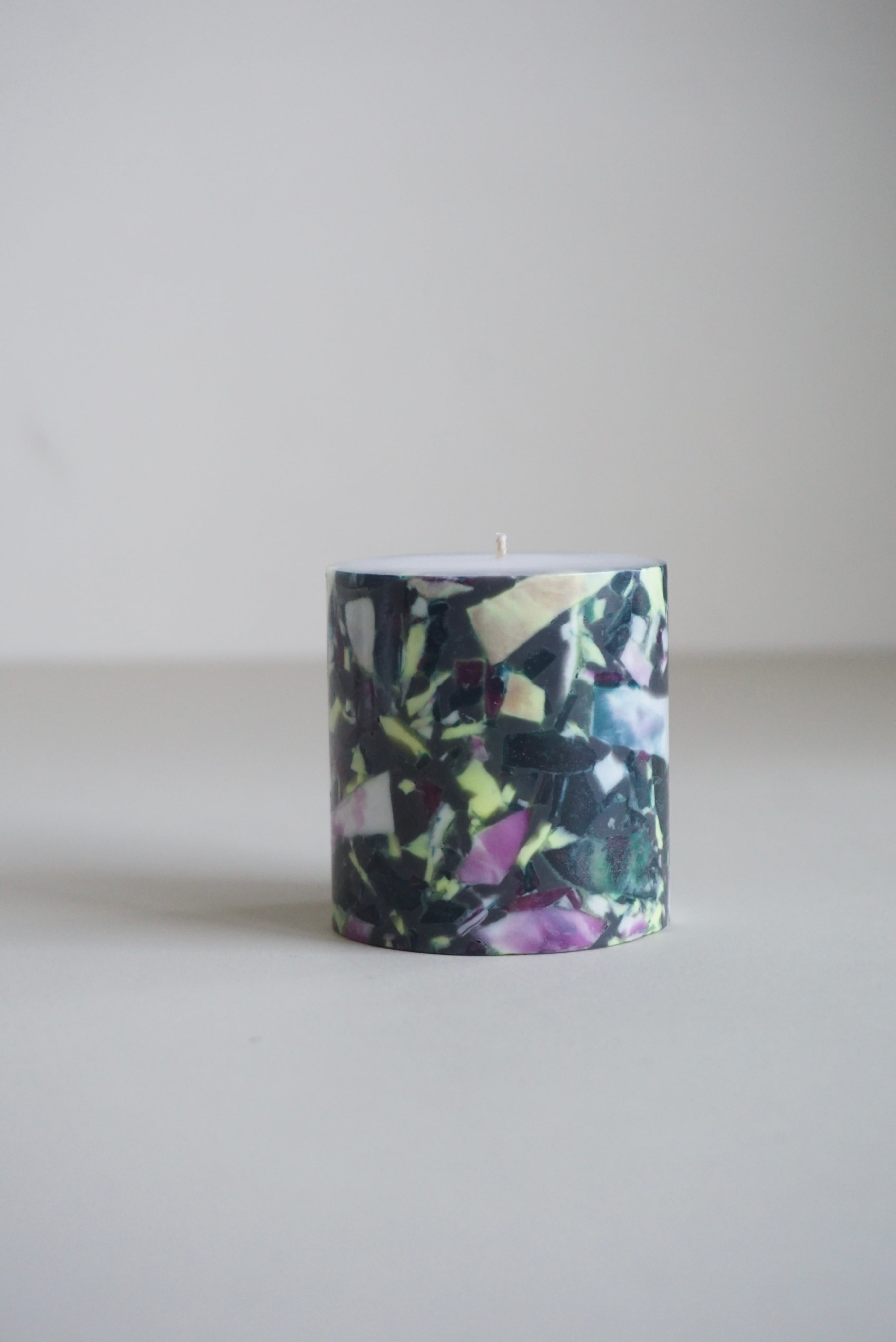 様々な色のかけらが混ざり合ったモザイクキャンドルです。こちらのキャンドルの側面はツルツルとした光沢のある質感に仕上げています。