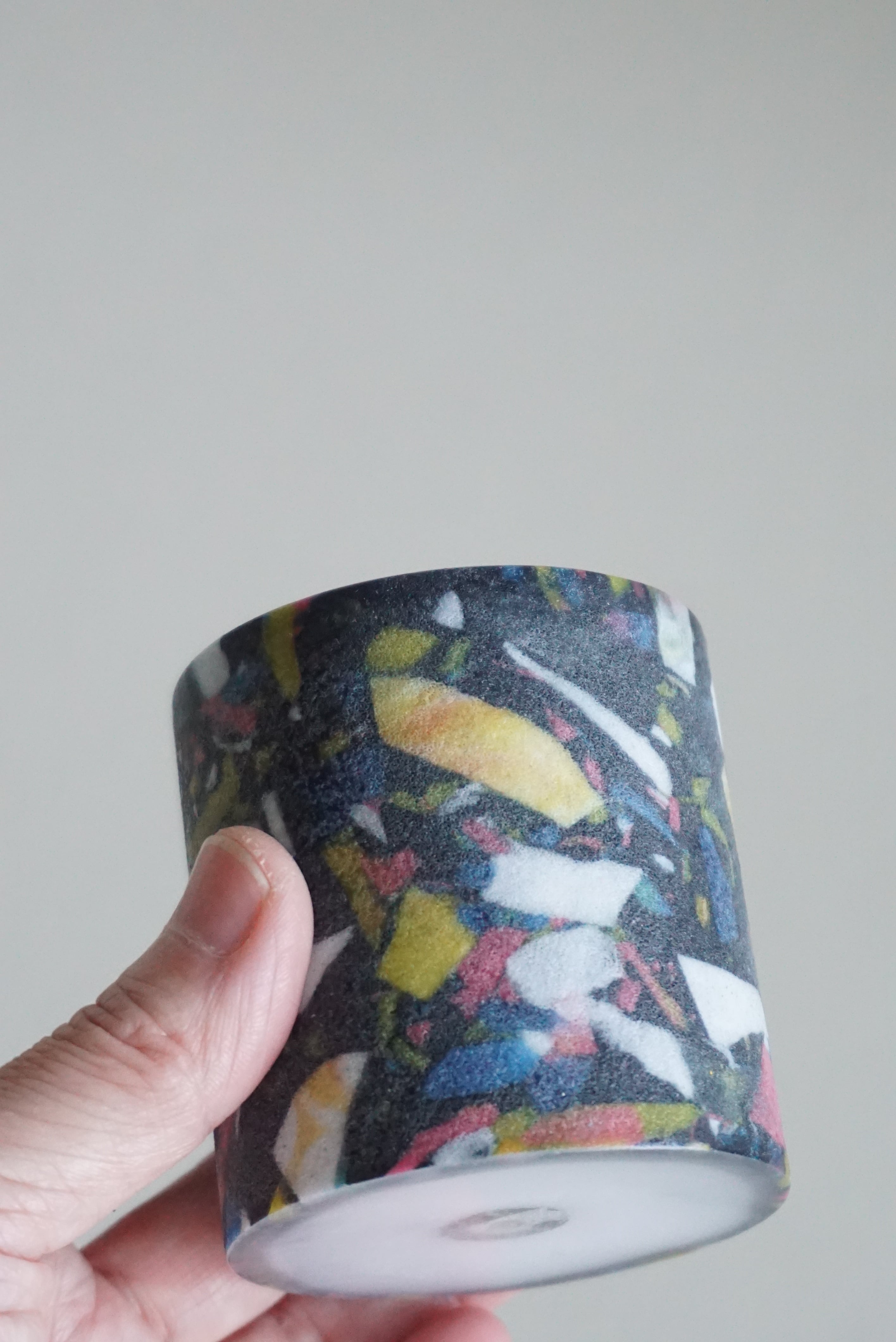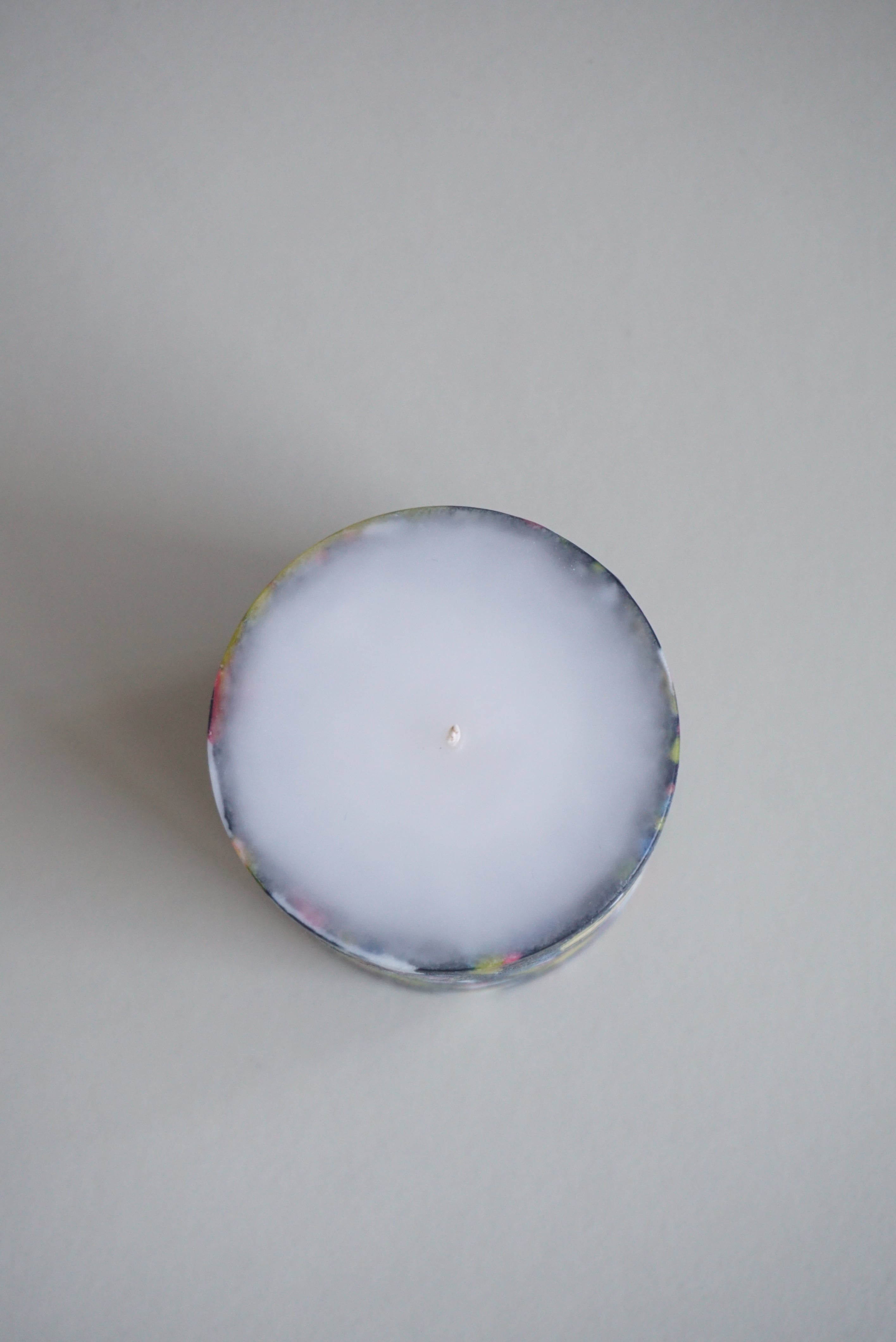 様々な色のかけらが混ざり合ったモザイクキャンドルです。こちらのキャンドルの側面はザラザラとした質感に仕上げています。