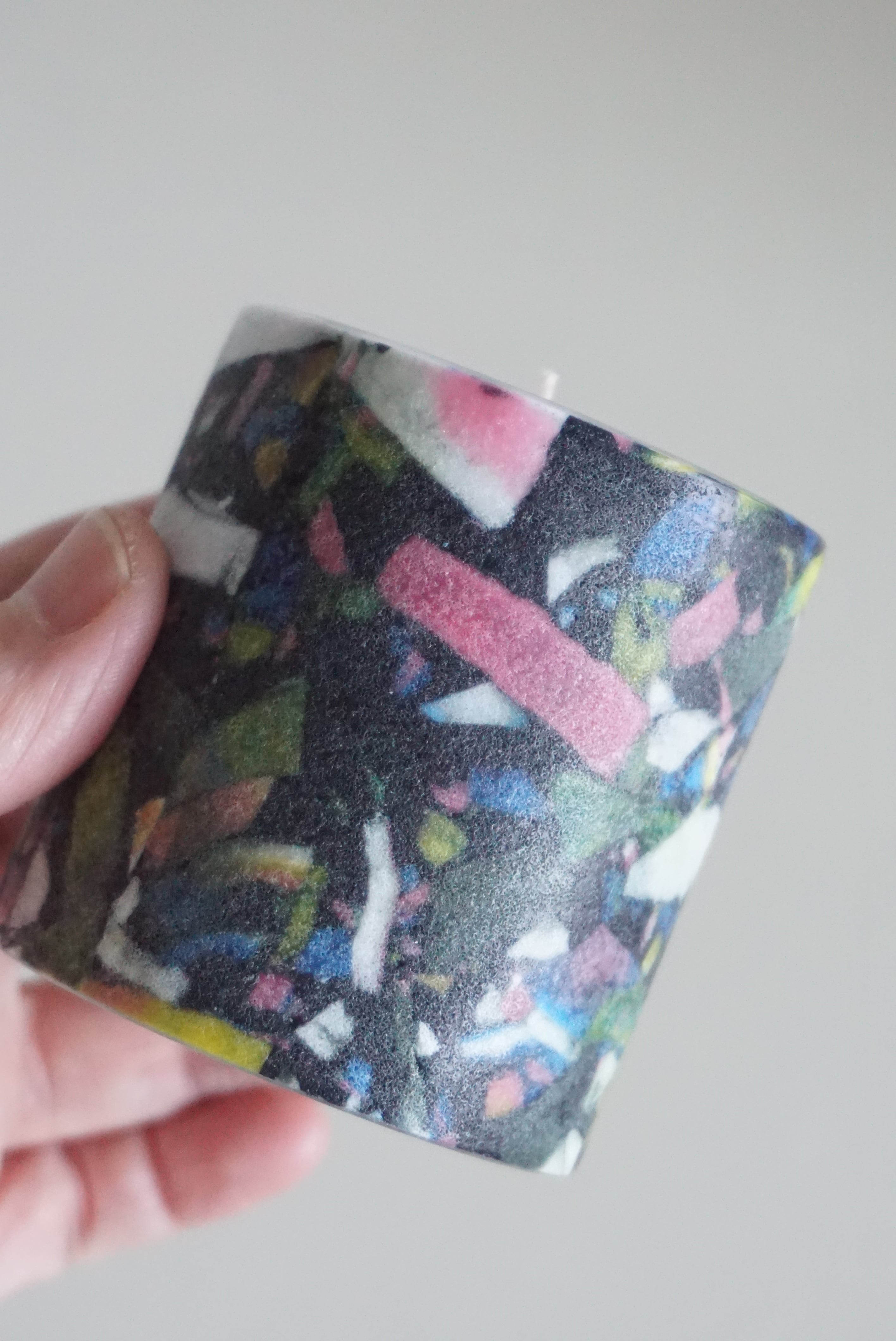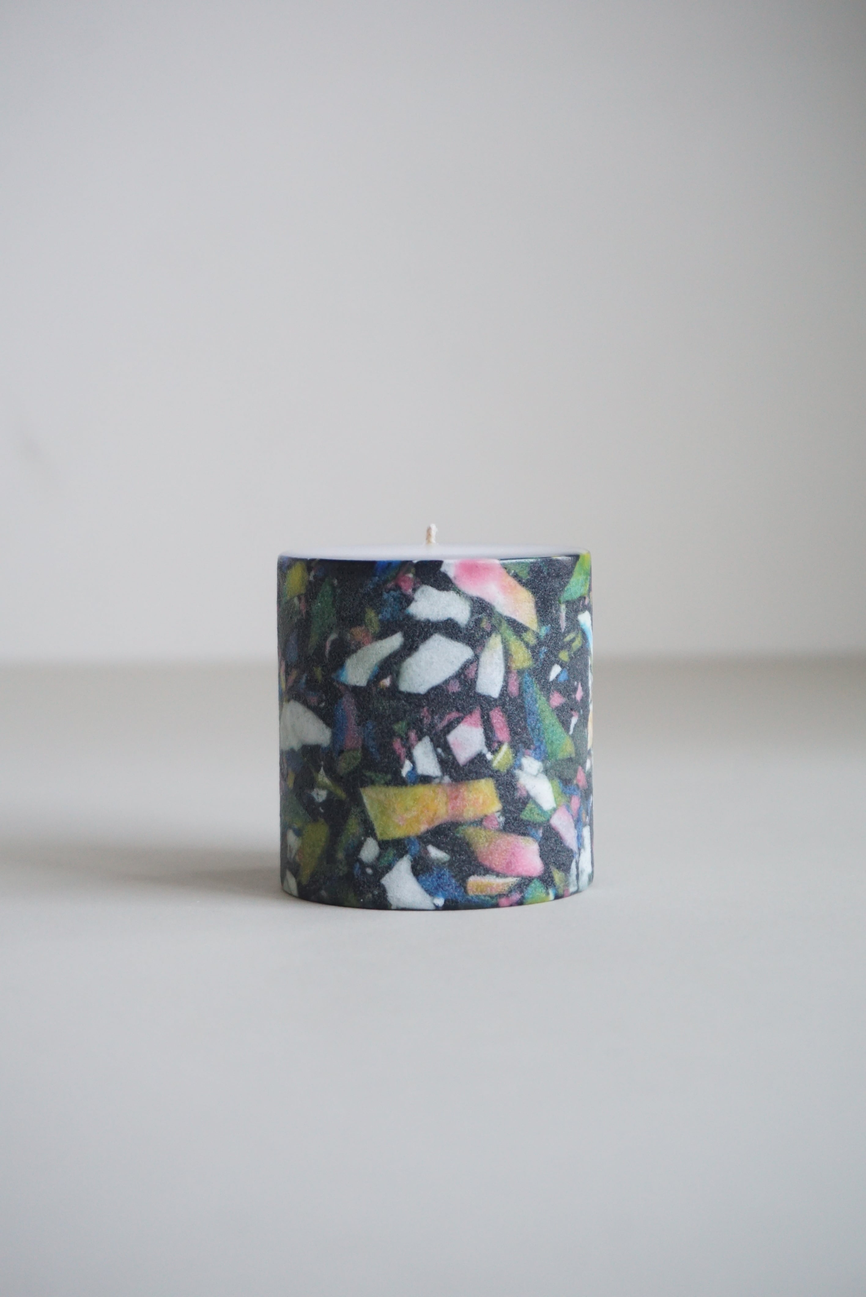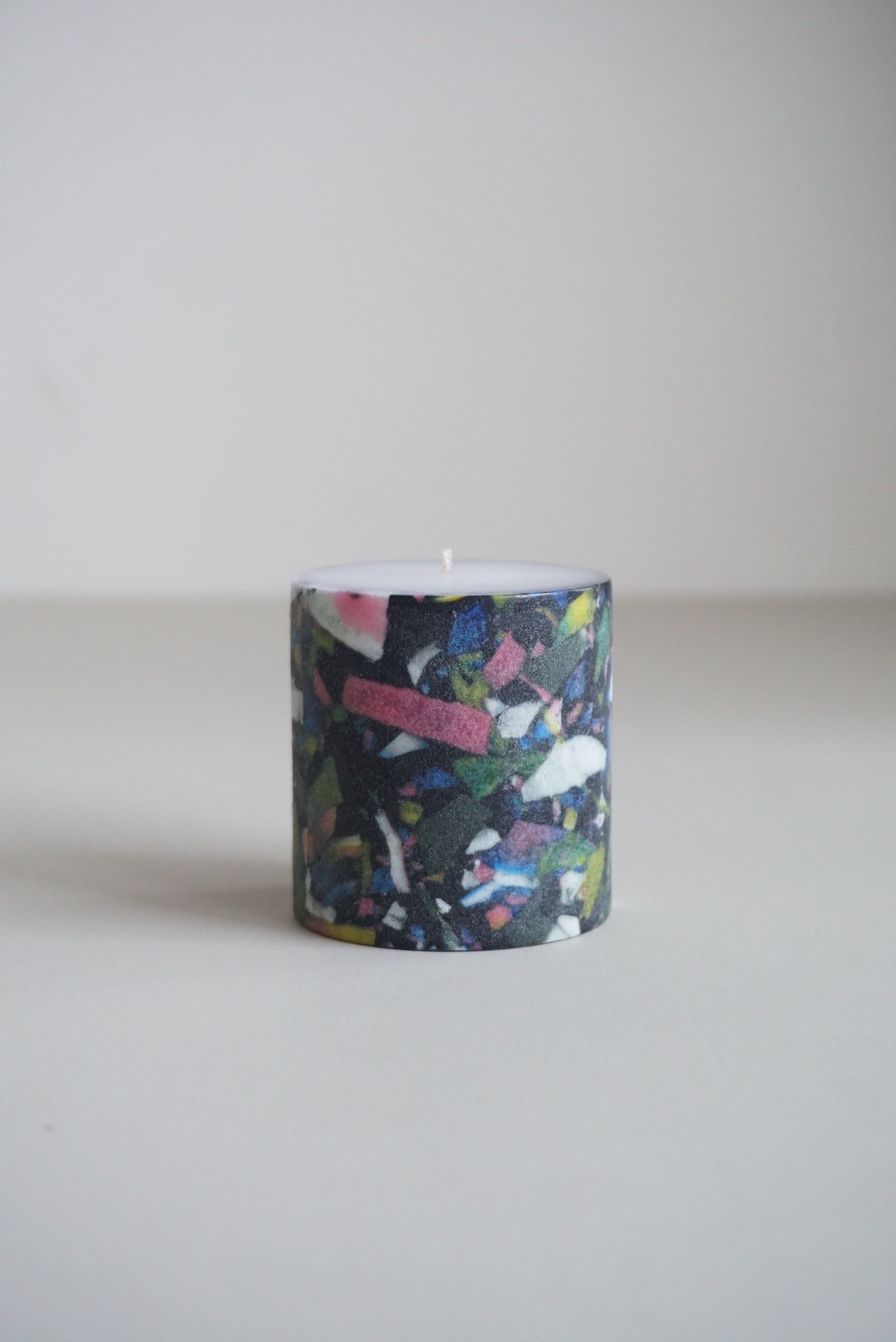 様々な色のかけらが混ざり合ったモザイクキャンドルです。こちらのキャンドルの側面はザラザラとした質感に仕上げています。