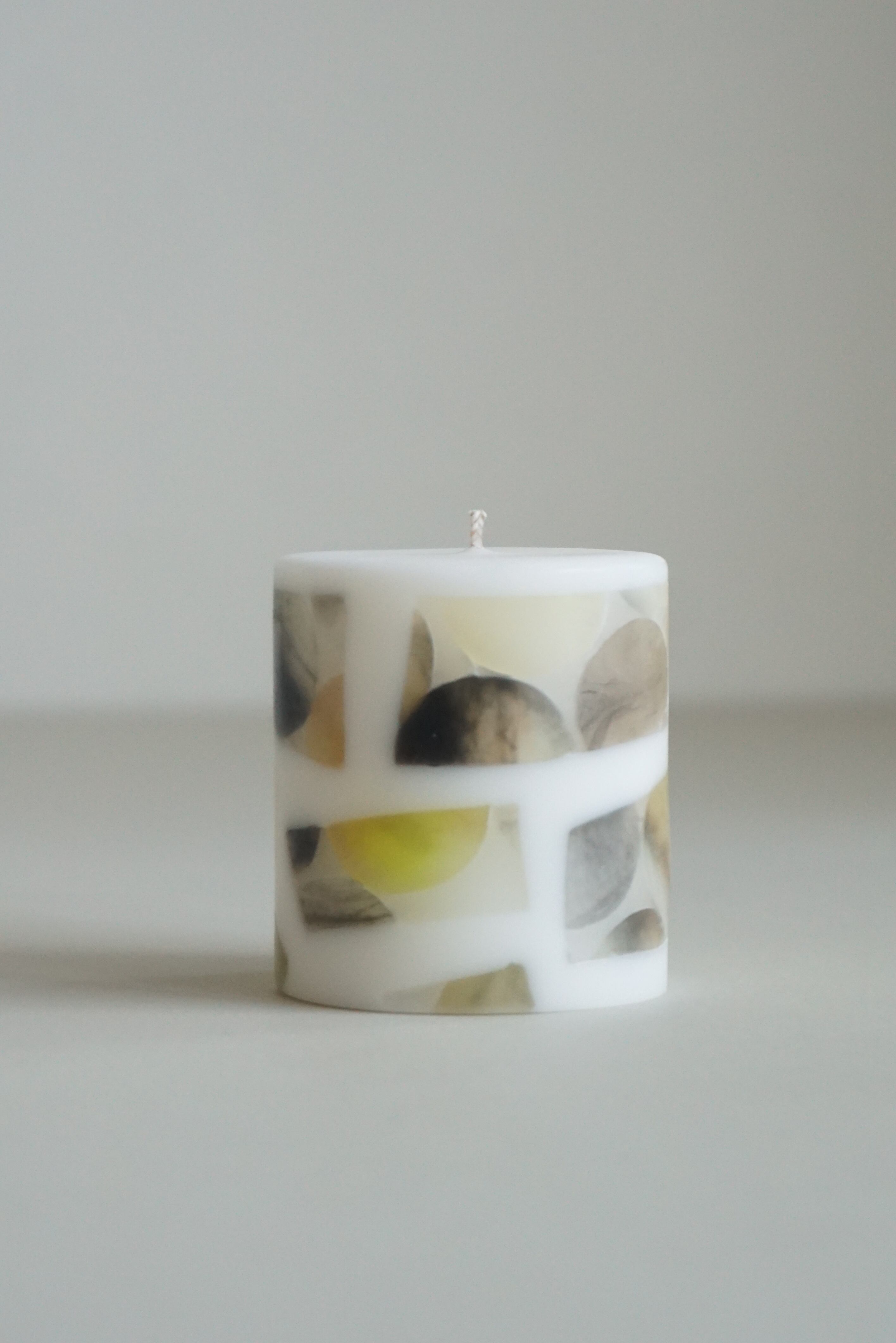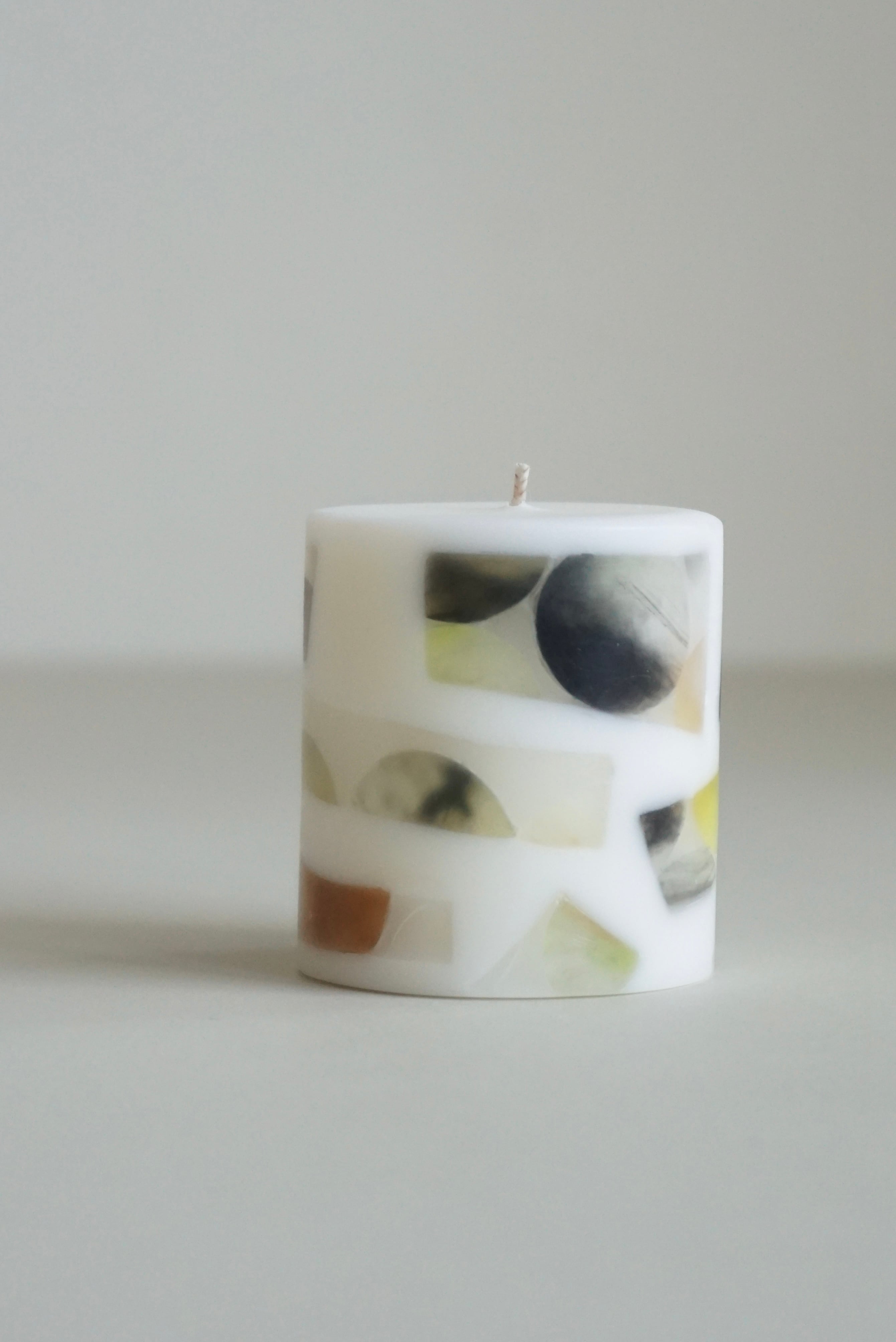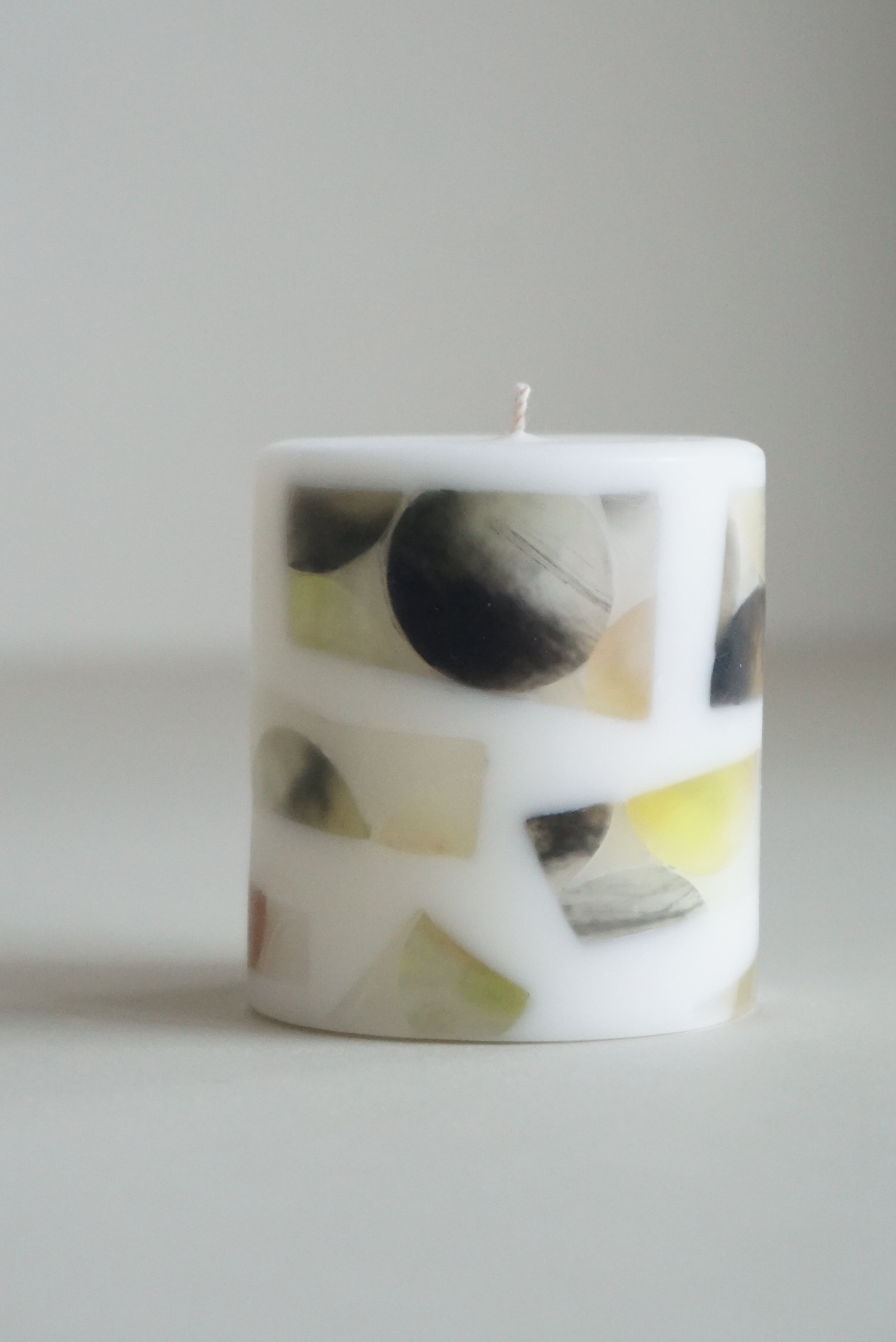 側面に様々な模様のパーツが散りばめられたキャンドルです。主に自然由来のワックスを使用して制作しております。