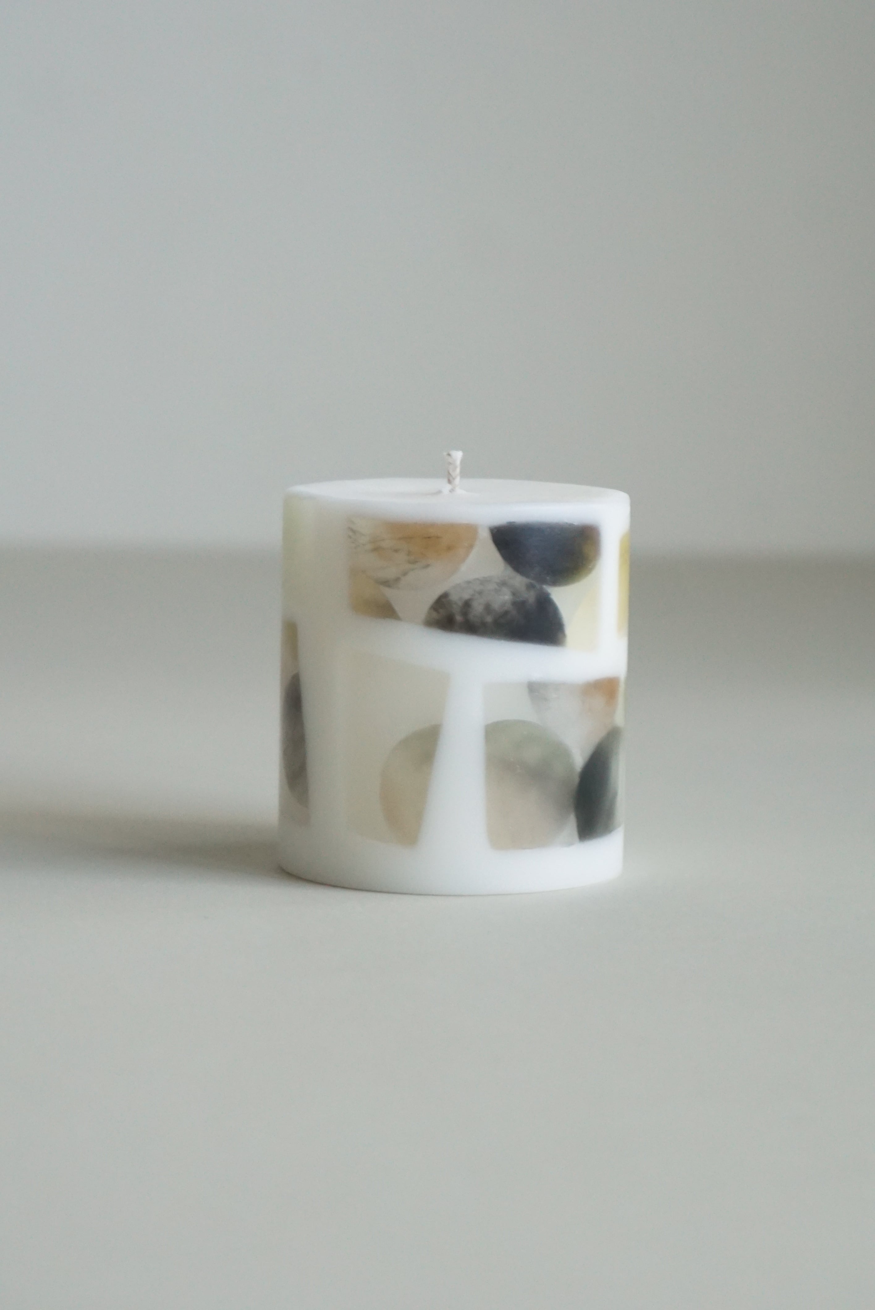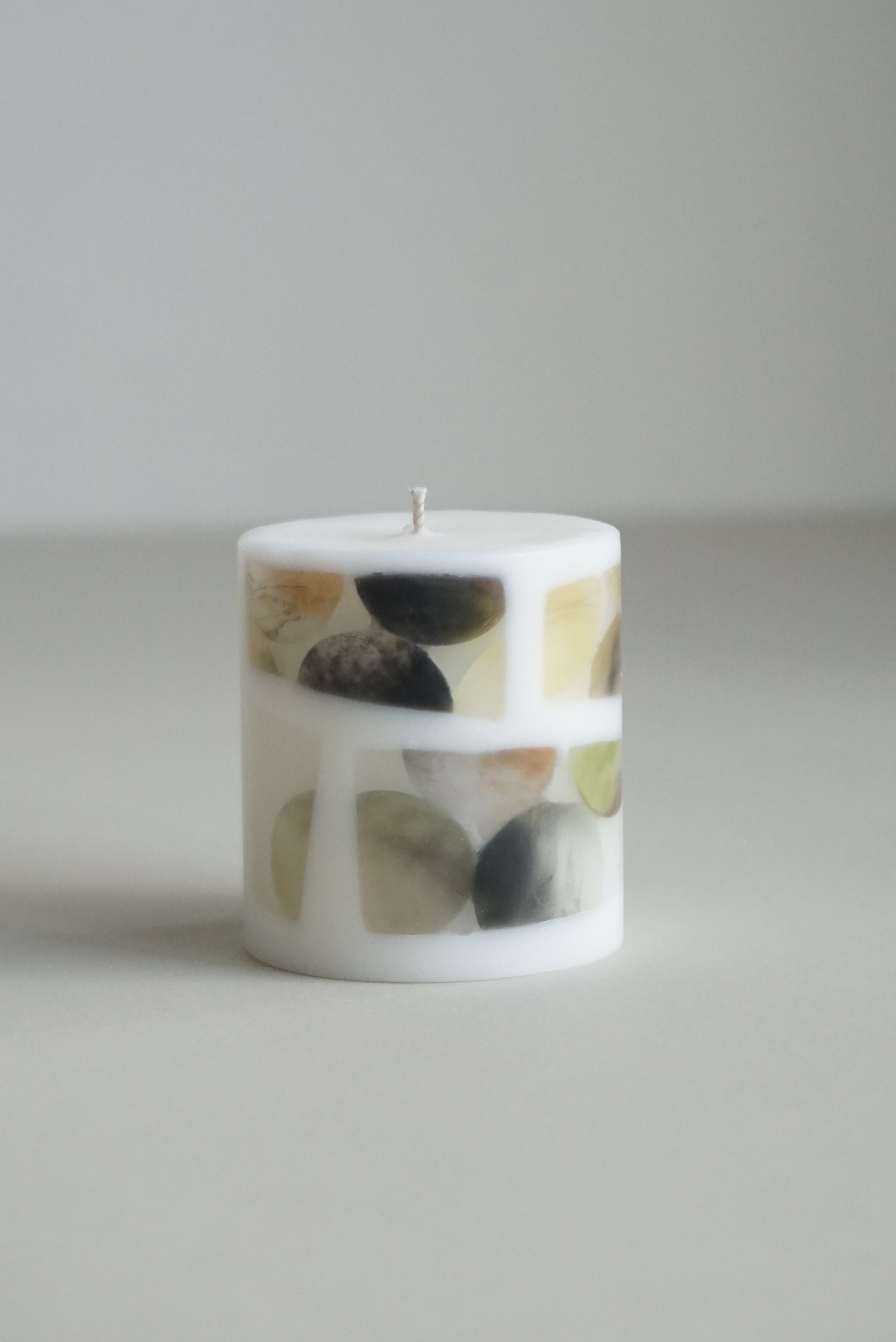 側面に様々な模様のパーツが散りばめられたキャンドルです。主に自然由来のワックスを使用して制作しております。