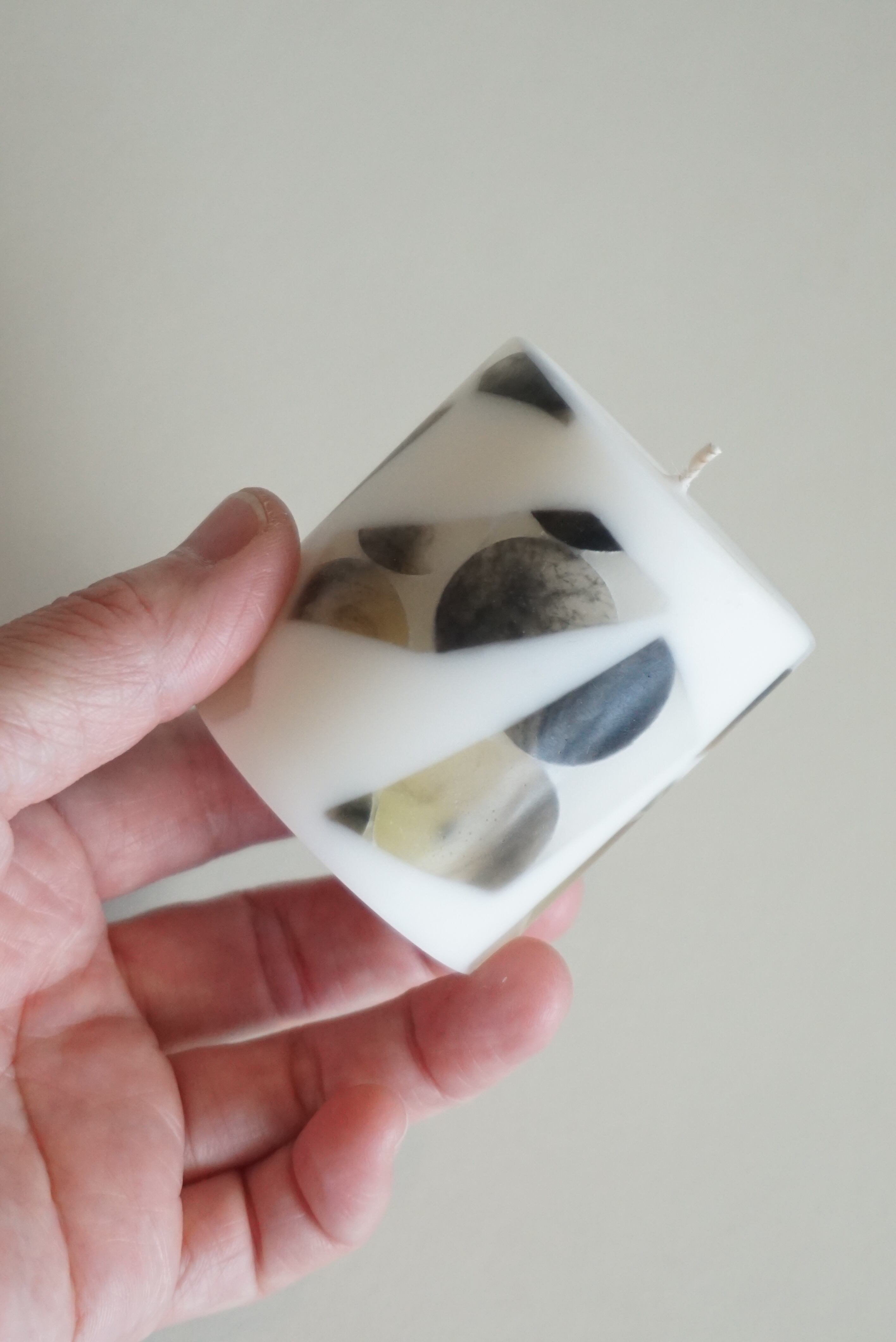 側面に様々な模様のパーツが散りばめられたキャンドルです。主に自然由来のワックスを使用して制作しております。