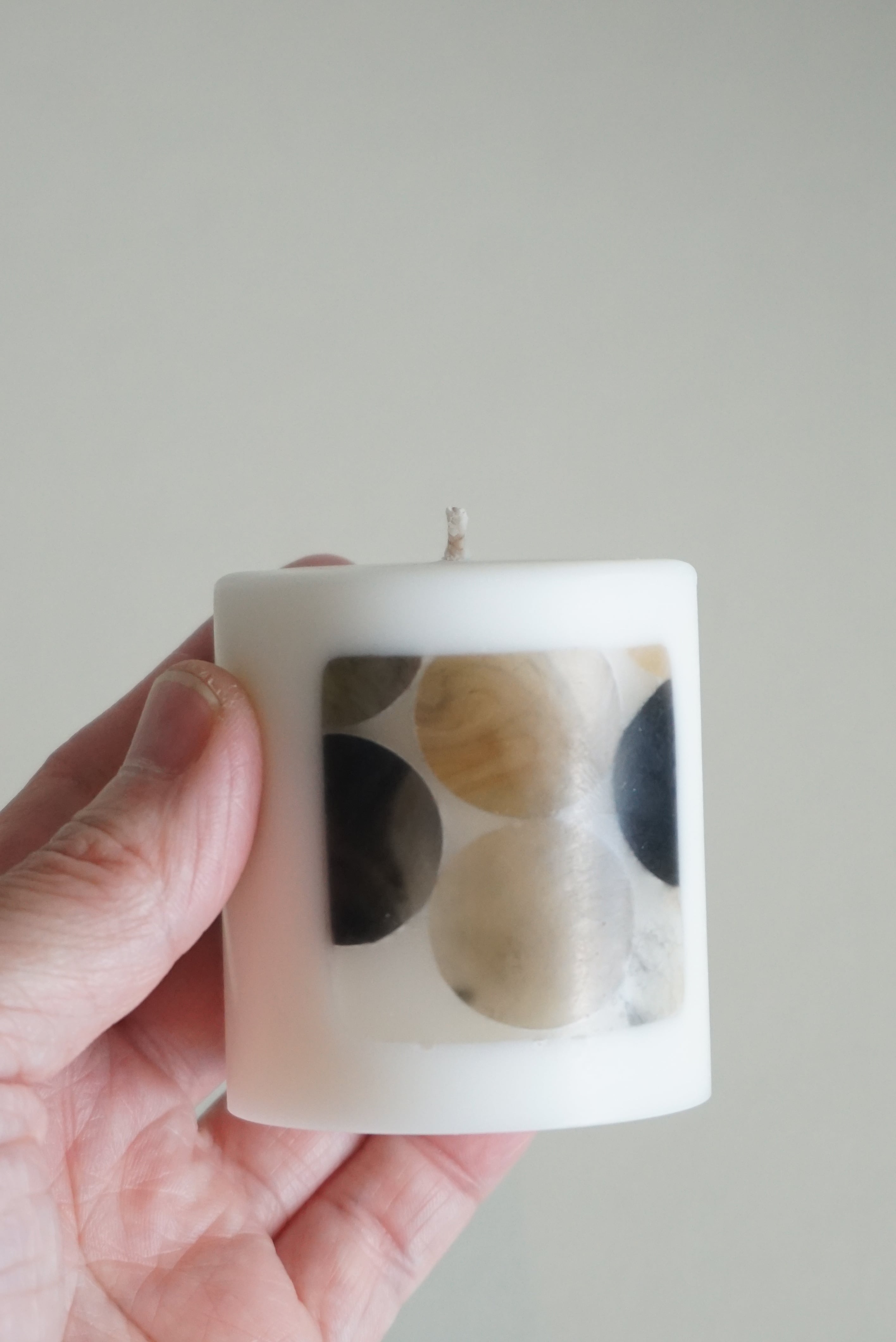 模様がほどこされた四角いパーツが両面に入っているキャンドルです。灯すとこのパーツ部分が照らされます。主に自然由来のワックスを使用して制作しております。