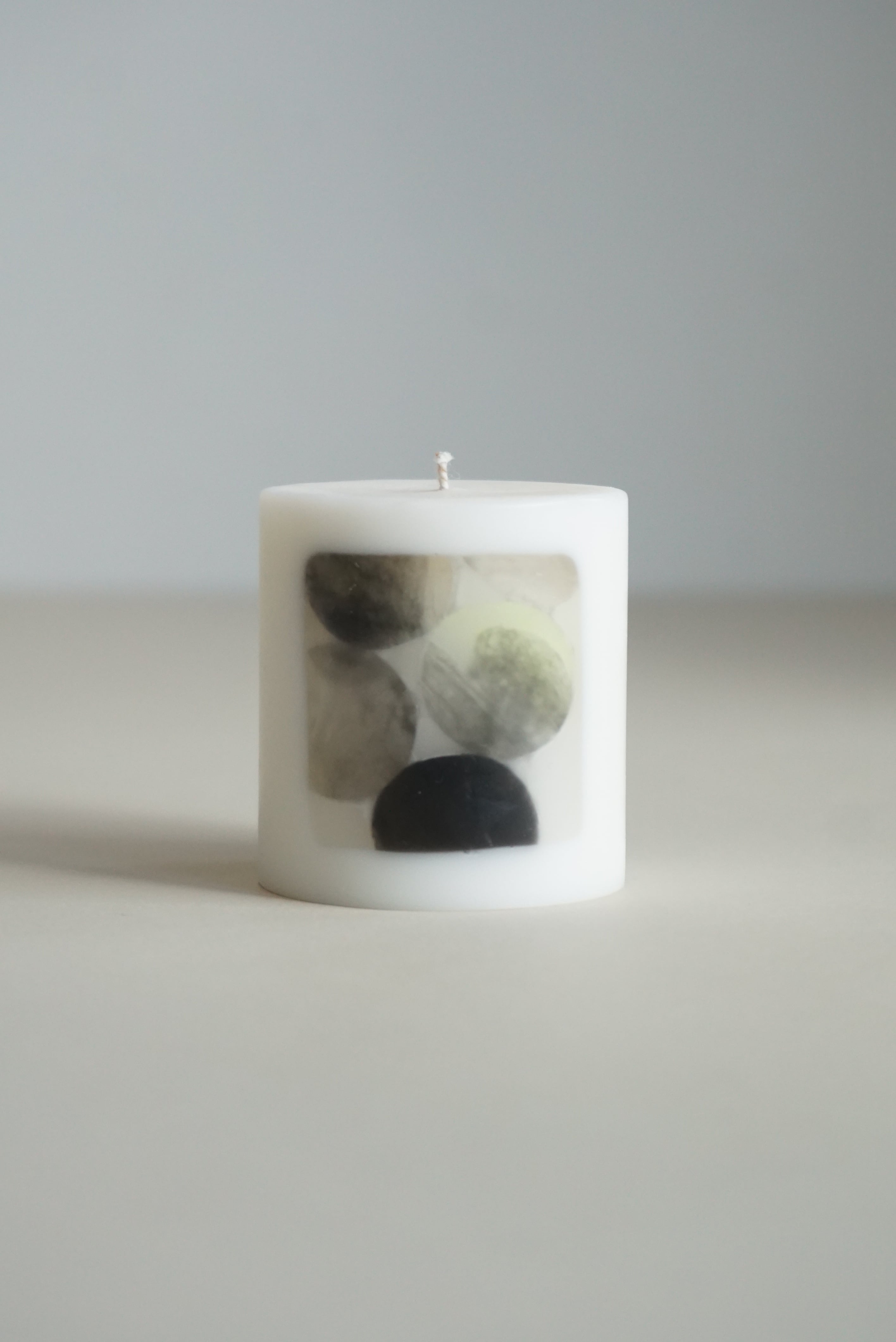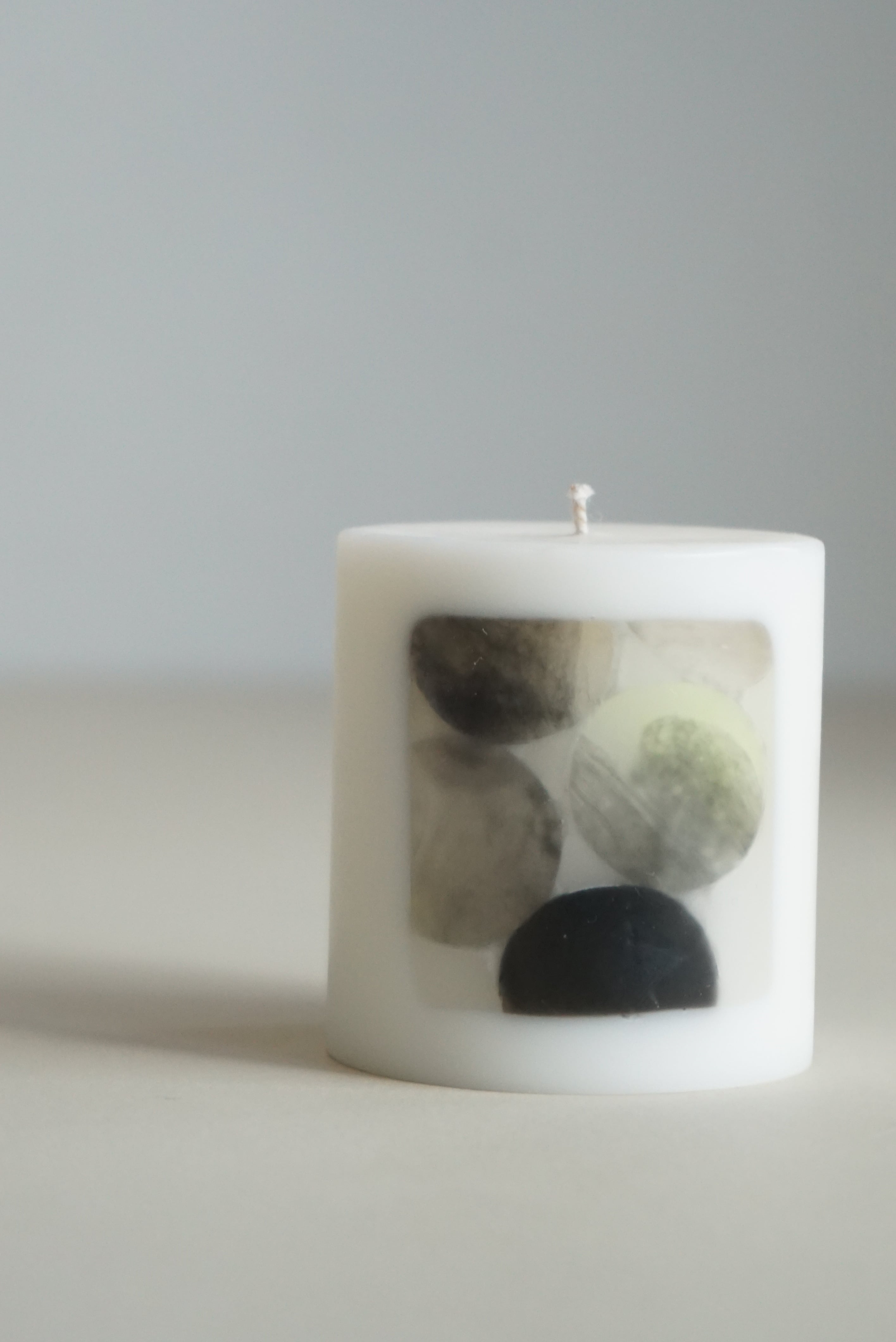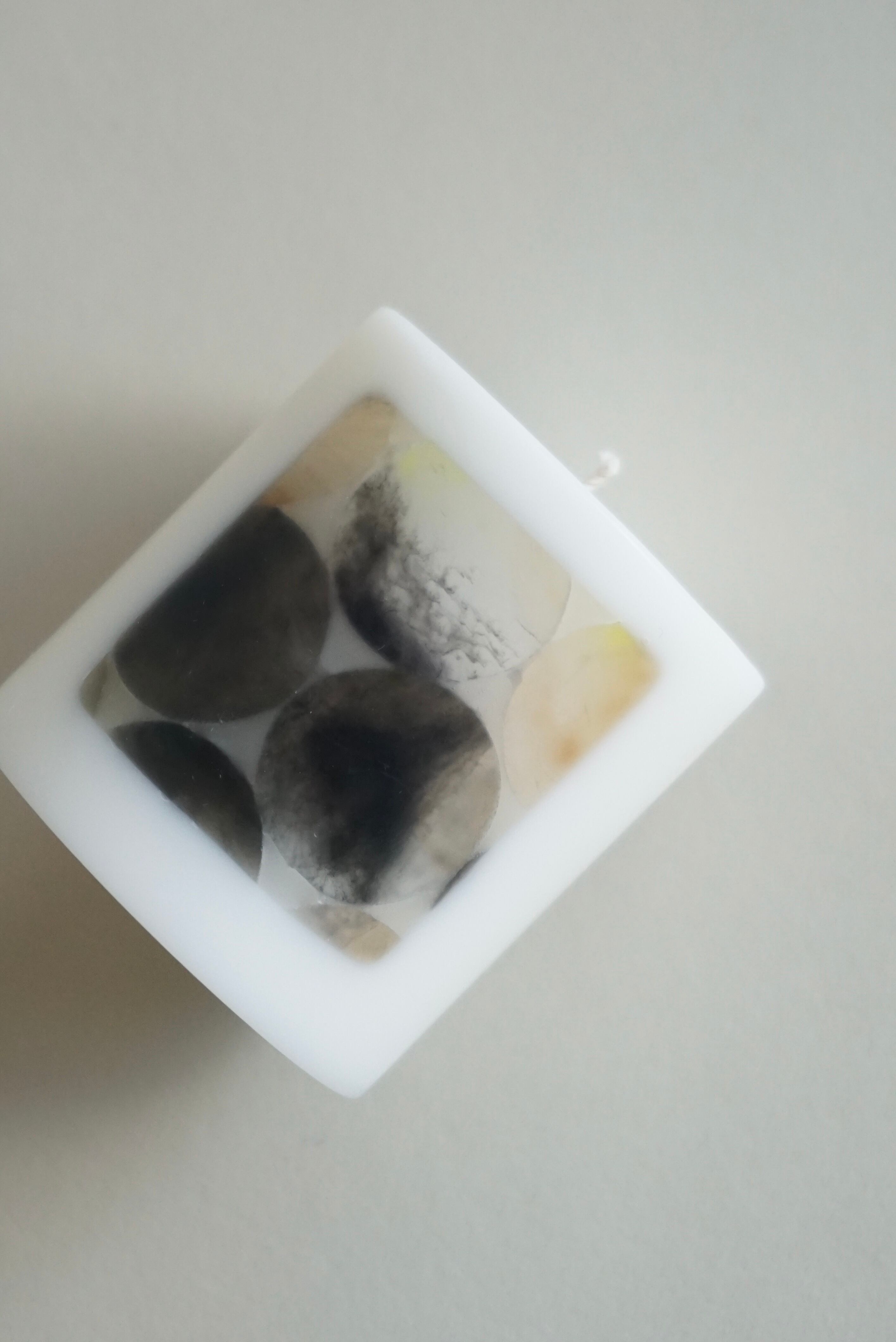 模様がほどこされた四角いパーツが両面に入っているキャンドルです。灯すとこのパーツ部分が照らされます。主に自然由来のワックスを使用して制作しております。
